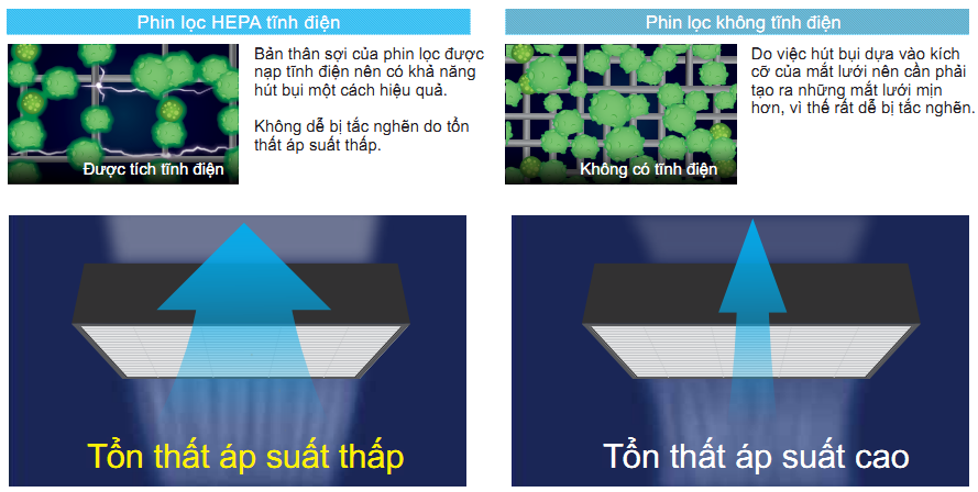 Phin lọc hút bụi hiệu quả bằng lực tỉnh điện, bui khó bị tắc hơn so với những phin lọc HEPA không tích điện khác hút bụi dựa vào độ mịn của lưới lọc. Vì vậy không khí lớn hơn có thể đi qua phin lọc. Nhờ đó mà phin lọc có thể lọc được lượng không khí nhiều hơn